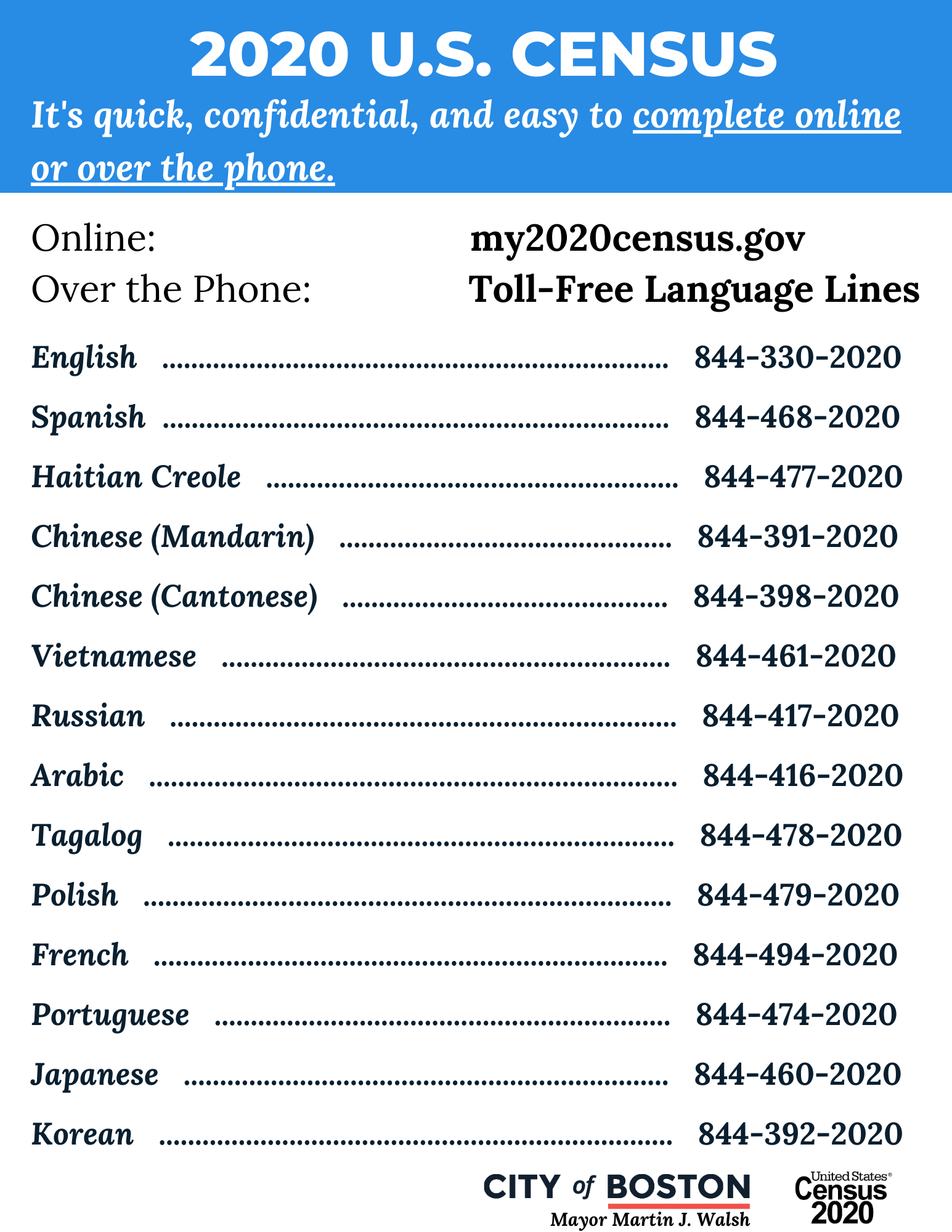 Responses to the 2020 Census are safe, secure, and protected by federal law. Your answers cannot be used against you by any government agency or court. The Census Bureau can’t share your personal information with DHS, law enforcement, or your landlord until 72 years have passed. It won’t affect any public benefits you receive. The 2020 Census is a way to directly increase community power. It will impact our daily lives for the next 10 years. Many of Boston’s communities are at risk of an undercount. We need a complete and accurate count because all of Boston deserves to be seen, heard, and invested in.