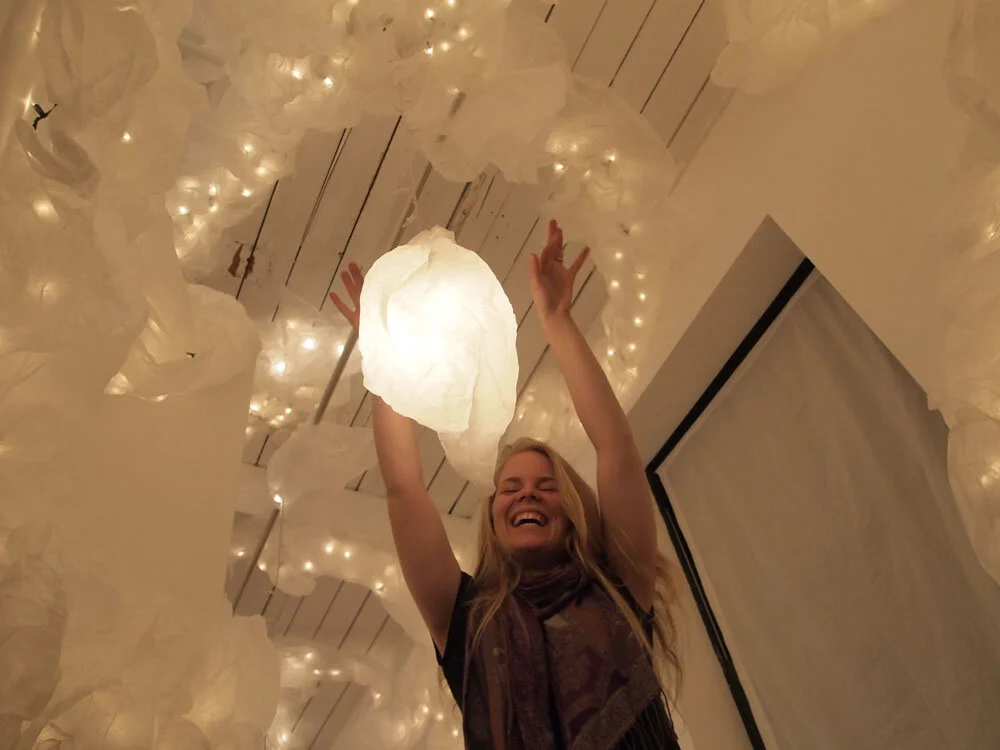 “Head in the Clouds” is a series of immersive, site-specific installations that bring the serenity and wonder of cloud-gazing indoors. Inspired by the idiom of the same name, these large, room-scaled environments feature glowing cloud-like structures crafted from vellum, translucent paper, and light. Visitors are invited to wander through these ethereal spaces, where soft illumination and intricate textures create a dreamlike atmosphere.